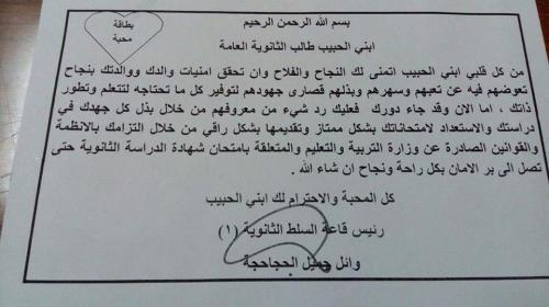 استقبل رئيس قاعة امتحانات ثانوية عامة في مدرسة السلط الثانوية ويدعى وائل الحجاحجه طلابه القادمين إلى القاعة رقم ١ بشكل عفوي عبر بطاقة حملت كلمات دافئة أزالت رهبة الامتحان من قلوب الطلبة.