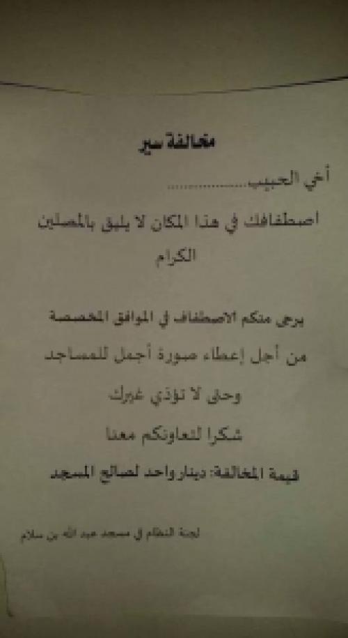 بادر امام مسجد عبدالله بن سلام في حل مشاكل الاصطفاف العشوائي امام المسجد بوضع مخالفة سير على المركبة قيمتها دينار واحد لصالح المسجد.