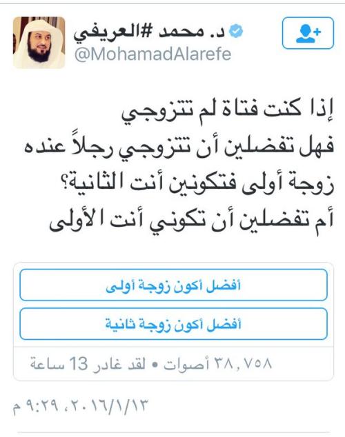 -أثار الشيخ الدكتور محمد العريفي جدلا واسعا بعدما طرح استفتاء مثيرا على الفتيات اللاتي لم يتزوجن حول إمكانية رضاهن أن يكن زوجات ثانيات من عدمه.