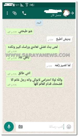 وأرسل المتصل رسالة الدردشة على تطبيق الواتس آب لـ'سرايا'، داعياً الزوجات عدم العناد مع ازواجهم، ومؤكدأ انه ليس نادم على قرار تطليقها، مشيراً انه من سكان العاصمة عمان، ومتزوج من خمسة اعوام، لكن الله لم يرزقهم للان اية أبناء.