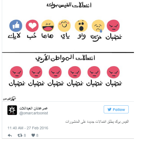 بعد أن أتاحت فيسبوك أمام الجميع كل الرموز للتعبير عن المشاعر تجاه ما ينشر عبر مختلف الحسابات، لا بأس بالقليل من النكتة والضحك، وهو ما قدمه رسام الكاريكاتير الأردني عمر العبداللات في أحدث إبداعاته الكاريكاتيرية.