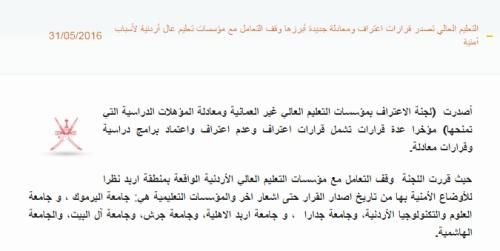 عُمان تلغي اعترافها بأهم الجامعات الأردنية الحكومية و الخاصة لدواعٍ "أمنية" .. بالاسماء 1-06-2016