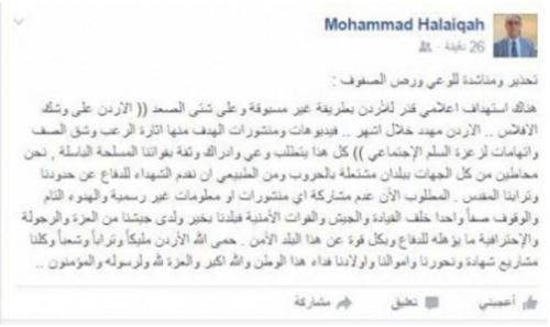 وطالب الحلايقة في منشور 'فيسبوكي' كتبه اليوم الجميع للثقة بقواتنا المسلحة، للابتعاد عن الاثارة الرعب وشق الصف.