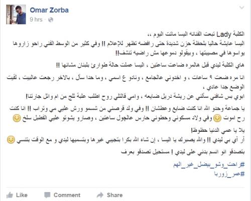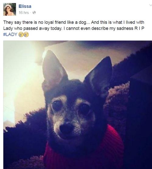 وكتب 'زوربا' على صفحته الرسميّة على 'فيسبوك' معلقاً على ذلك بالقول: 'الكلبة Lady تبعت الفنانه اليسا ماتت اليوم ، اليسا عايشة حاليا بلحظة حزن شديدة حتى رافضه تظهر للإعلام !! وفي كثير من الوسط الفني راحو زاروها يواسوها في مصيبتها ، وبيقولو دموعها مش راضيه تنشف!!'.