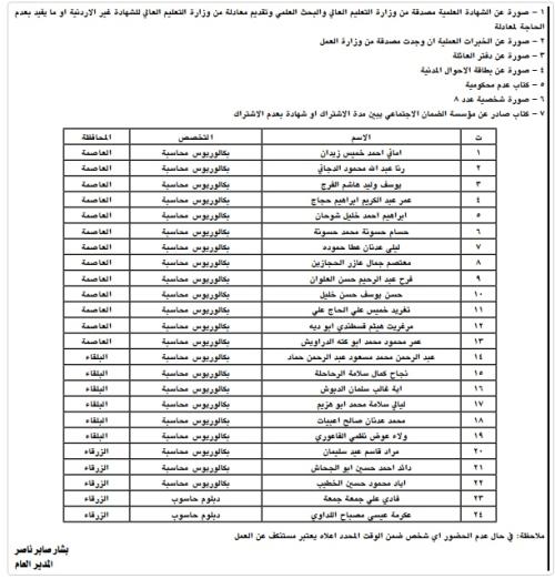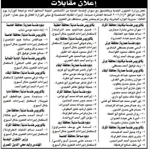 كما دعت وزارة الشؤون البلدية وبالتنسيق مع ديوان الخدمة التالية اسماؤهم لمراجعتها في تمام الساعة العاشرة من صباح يوم الأربعاء 3 آب 2016 لإجراء المقابلة الشخصية في مبنى الوزارة الكائن في جبل عمان - الدوار الثالث، واعتبار كل من لم يحضر مستنكفا عن التعيين.