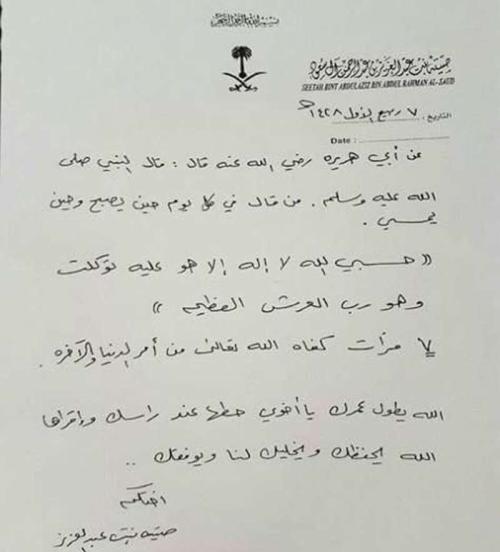 وأوصت الأميرة في رسالتها المتداولة، شقيقها بأن يلتزم بالدعاء الذي ورد عن النبي صلى الله عليه وسلم: 'من قال في كل يوم حين يصبح وحين يمسي: حسبي الله لا إله إلا هو عليه توكلت وهو رب العرش العظيم' سبع مرات كفاه الله تعالى ما أهمَّه من أمور الدنيا والآخرة'.