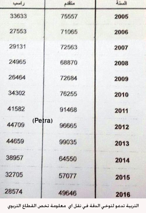 كشفت وزراة التربية والتعليم السبت أعداد الطلبة النظاميين الراسبين بامتحان شهادة الدراسة الثانوية العامة 'التوجيهي' من الأعوام من 2005- 2016.