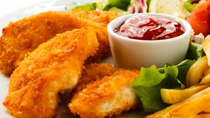 5- أزيلي قطع الدجاج من كيس الدقيق، غمّسيها بمزيج البيض أولاّ ثم بمزيج البقسماط.