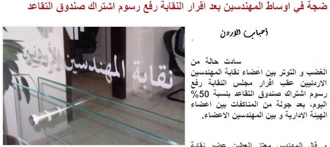 سادت حالة من الغضب و التوتر بين اعضاء نقابة المهندسين الاردنيين عقب اقرار مجلس النقابة رفع رسوم اشتراك صندوق التقاعد بنسبة 50% اليوم، بعد جولة من المناكفات بين اعضاء الهيئة الادارية و بين المهندسين الاعضاء.