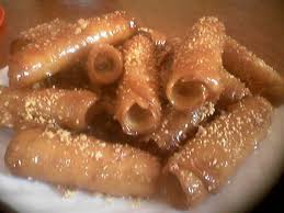 تبسط عجين تلف على قصبة صغيرة وتقلى في زيت تدهن بالعسل وتغمص بلوز مهرمش.