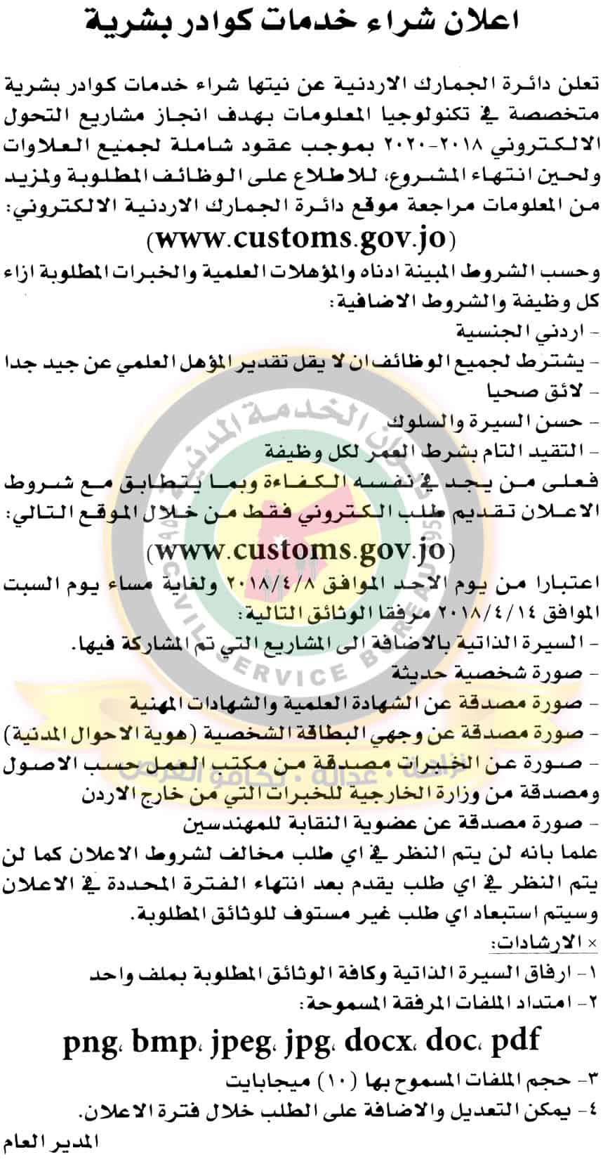 تعلن دائرة الجمارك الأردنية عن نيتها شراء خدمات كوادر بشرية متخصصة في تكنولوجيا المعلومات