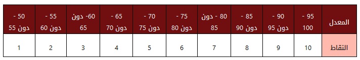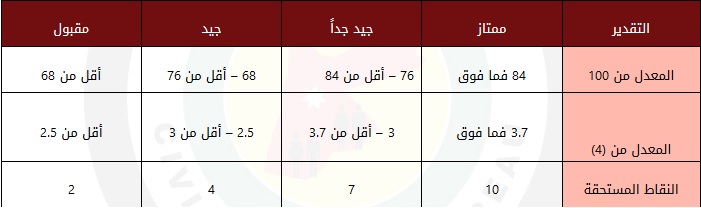 وفي حال ورود أي تقدير من غير المسميات المذكورة في الجدول أعلاه يتم اعتماد علامة المعدل .
