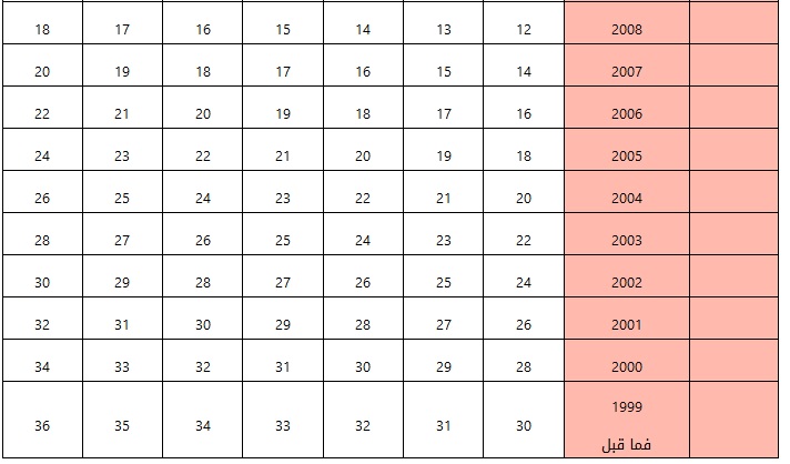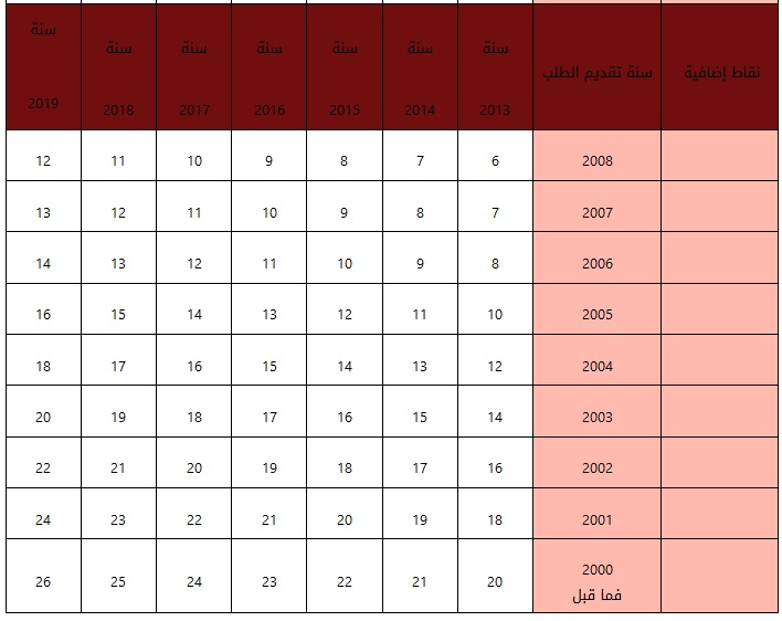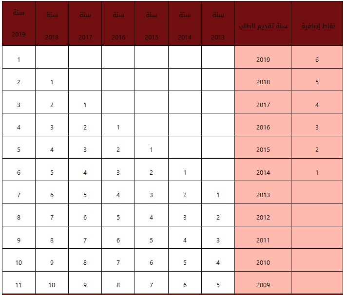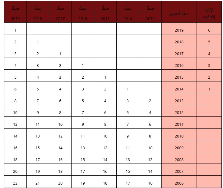 ب-1- أقدمية التخرج: وتقاس بعدد السنوات التي مرت على تاريخ حصول صاحب الطلب على المؤهل العلمي المعتمد للتنافس وتعتبر سنة 1999 سنة أساس و تحسب النقاط وفقا للجدول التالي، كما يضاف لنقاط اقدمية التخرج الواردة في هذا الجدول نقطة واحدة تدريجيا في كل عام بحد أقصى (5) نقاط مع اعتماد عام (1999) فما قبل سنة أساس لأقدمية التخرج وتحسب وفقا لما هو موضح في هذا الجدول .