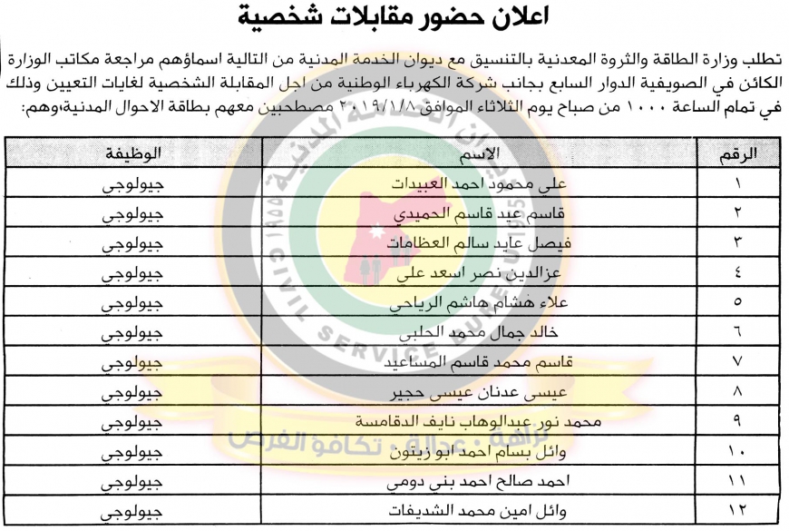 اعلان صادر عن وزارة الطاقة والثروة المعدنية لغايات اجراء المقابلات الشخصية لتعين بتاريخ 8/1/2019 بالتنسيق مع ديوان الخدمة المدني